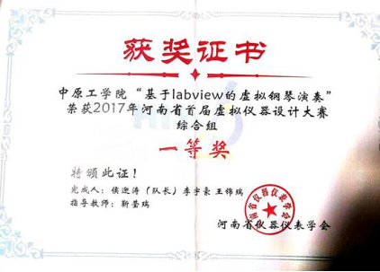 2017年度河南省首届虚拟仪器设计大赛一等奖1项、等奖1项。